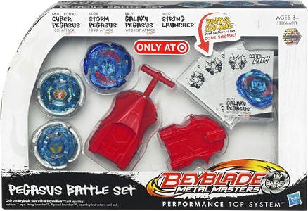 Add some major attack to your arsenal with the PEGASUS BATTLE SET! With 3 fivepiece customizable tops, 2 launchers and an assembly tool, youll be ready for all kinds of battles against any opponent who wants to take you on! Whether youre after aggressive spin or increased gripping power, the PEGASUS BATTLE SET has the pieces you need. Customize your tops for battle, then use the STRING LAUNCHER for superfast launches!Set includes 3 fivepiece tops, STRING LAUNCHER, RIPCORD LAUNCHER*, assembly instructions and tool.Attack 105F BB01 LEGEND CYBER PEGASUS*Attack 105RF BB28 STORM PEGASUSAttack W105R2F BB70 GALAXY PEGASUS*BB17 STRING LAUNCHER Read moreRelateItems